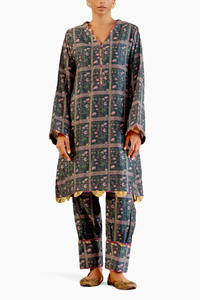 Embrace effortless festive elegance with our kalidar kurta and slim gathered salwar set, crafted in a signature sage print on opulent chanderi fabric. The kalidar kurta, with its flowing, flared design, offers both comfort and style, while the slim gathered salwar complements the ensemble with a sleek, tailored fit. Adorned with delicate gota-kinari detailing, this easy-to-wear co-ord effortlessly blends traditional charm with contemporary sophistication, making it the perfect choice for any celebration.