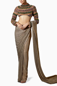 Featuring Amun-Ra Saree Set by ITRH from their Titi Collection. The vibrant multicolored jewel top, adorned with dazzling big crystals, radiates glamour and allure, drawing eyes with its captivating sparkle. Paired with dusky gold emebellished prestitched saree.