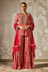 The Anaya Kurta Set is a perfect blend of grace and modernity, showcasing a printed georgette placement embroidered short kurta paired with printed georgette flare pants. Finished with a soft organza ruffled net dupatta, this set embodies effortless sophistication for chic ethnic occasions.