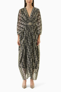 Bold, yet sensual, the Andrea Kaftan dress is made to steal the spotlight. The black and silver metallic print is crafted and has lined body for a soft touch and features a straight, relaxed cut. This dress showcases a deep V-neck with handmade Swarovski crystal brooch and a flattering maxi length.