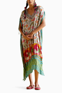 Turquoise Color Kaftan in Pichwai prints digital Kalamkari design with Cutdana strings embellishment on the edges.