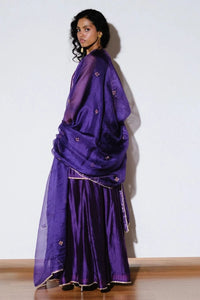 Featuring the Angoor Dupatta, an embroidered deep purple Kota doria silk piece. It is embellished with delicate fringed gota lace and handcrafted in India. Measuring 2.5 meters in length, this elegant dupatta adds a graceful touch to any outfit.