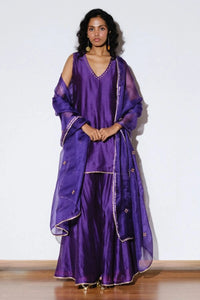 Featuring the Angoor Silk Sharara Set in royal purple Chanderi silk. The kurta has a side zipper, bijiya gota, and bright pink peek-a-boo contrast at the hem. Paired with sharara pants with a side zipper and button fastening, it includes an embroidered silk Kota doria dupatta with bijiya gota. Fully lined and handcrafted in India.