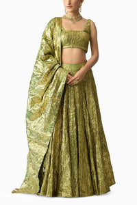 The Angoori Lehenga Set features a radiant green and gold lampi lehenga paired with a sleeveless square-neck blouse and a matching lampi dupatta. This elegant ensemble combines traditional craftsmanship with modern style, finished with back hook and side zip closures for a perfect fit.