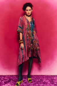 A beautiful silk tie-dye kaftan adorned with intricate applique embroidery, showcasing a vibrant blend of colors and exquisite craftsmanship. This flowing piece exudes elegance and comfort, making it perfect for relaxed outings or special occasions, where style meets effortless chic.