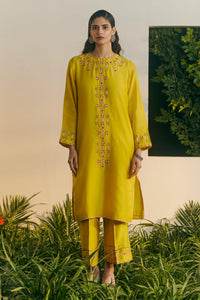 Featuring Anika Kurta Set by Shikha Mehta from Baagh Collection. This yellow silk chanderi kurta is relaxed fit and short in length, accentuated by elegant thread embroidery. It pairs seamlessly with matching silk chanderi wide-leg pants, creating a stylish and comfortable ensemble with luxurious detailing.