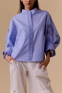 Featuring a modern twist on a summer essential, the Ann shirt is crafted from 100% cotton poplin with semi-sheer floral cutwork sleeves. Its versatile sleeve design, ribbon-detailed placket, and mandarin collar make it a stylish and breathable choice for warm-weather days.