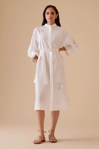 Featuring a versatile design perfect for summer, the Ann dress is crafted from premium cotton poplin with semi-sheer floral cutwork details. Its eclectic sleeves can be styled multiple ways, making it an effortlessly chic staple for everyday wear with a touch of elegance.
