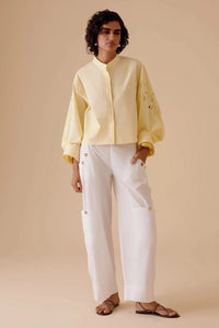 Ann shirt features an eclectic sleeve that can be buttoned up in more ways than one! Crafted in premium cotton poplin, this everyday shirt features semisheer floral cutwork details on the sleeves. High-waisted cargo pants made from 100% cotton poplin, featuring functional pockets and stylish horn buttons on the pockets.