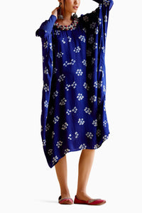 Handcrafted blue bandhini Kaftan with hand embroidered neckline with cowry Shells and cotton thread and ghungroos. The sleeves cuffs are made of hosiery fabric to give a stylish look to the ensemble !
