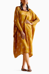 Handcrafted blue bandhini Kaftan with hand embroidered neckline with cowry Shells and cotton thread and ghungroos. The sleeves cuffs are made of hosiery fabric to give a stylish look to the ensemble !