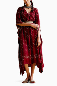 Maroon Kaftan in handcrafted bandhini , with handcrafted beaded belt finished with tassels. embellished V neck with beads detailing to create a stunning look!