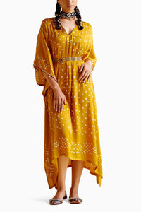 Mustard Kaftan in handcrafted bandhini , with handcrafted beaded belt finished with tassels. embellished V neck with beads detailing to create a stunning look!