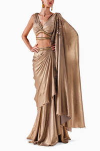 Featuring Antique Gold Elegance Saree by Mandira Wirk. Elevate your look with our metallic antique gold drape saree, adorned with an embellished belt. Paired seamlessly with a luxurious metallic blouse, this ensemble exudes timeless elegance and sophistication, perfect for any special occasion.