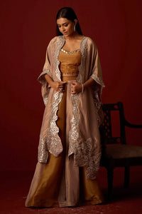 Exude regal elegance with this antique silver tissue mirrorwork cape set. Featuring a scalloped-edge cape with intricate zari appliqué, paired with dual-toned silver and gold panelled palazzos and an antique gold mirrorwork bandeau. This harmonious ensemble blends vintage charm with modern sophistication for unforgettable festive occasions.