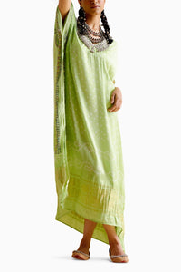 Neon Kaftan in handcrafted bandhini with Kalamkari print detailing, with peacock motifs and ghungroos embellished V neck, and tie-up detailing on the shoulders with ghungroos to create a stunning look!