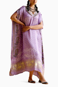 Purple Kaftan in handcrafted bandhini with Kalamkari print detailing, with peacock motifs and ghungroos embellished V neck, and tie-up detailing on the shoulders with ghungroos to create a stunning look!