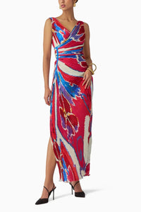 Featuring Anya Ikat Pleat Overlap Dress by Saaksha & Kinni, this elegant dress features an Ikat print-inspired design with hand micro pleating and an overlap style. It is complemented by adjustable side drawstring detailing for a chic, customizable fit and sophisticated look.