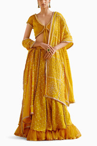 Featuring Aparna Yellow Lehnga Set by 5 Elements by Radhika Gupta from Mitti Collection. This Bandhini lehenga, crafted from modal Saturn fabric,showcases panels embellished with ghungroos. The Mashru silk blouse is adorned with ghungroo-edged embellishments for a striking appearance. The viscose georgette dupatta is richly embroidered with sequins and Goota work.