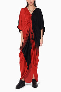This luxurious kaftan dress features deep, saturated colors achieved through hand-dyeing, creating a rich, vibrant effect. The ruched front detail adds texture and dimension, making it a standout piece that effortlessly combines elegance with artistic flair.