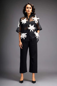 Featuring high-low sheer top with delicate floral applique, paired with tube and pants.