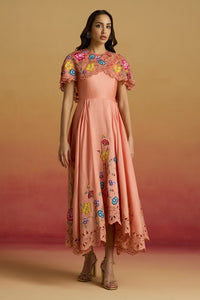 Featuring Apricot Cape Detail Flounce Dress by Chandrima’s Amaryllis FW25 Collection. An apricot chanderi flounce dress with multicolour floral threadwork and bead embellishments, complemented by a cape detail, blending artisanal craftsmanship with a modern, statement-making design.