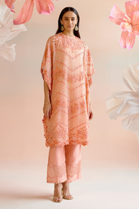 Introducing our exquisite apricot silk organza kaftan, featuring stunning multitonal cutwork and intricate beadwork that elevate this piece to a new level of elegance. This elegant piece is paired with Chanderi pants, beautifully designed with striking chevron organza details. These stylish pants offer a flattering fit and a modern twist, making them perfect for both casual outings and festive occasions.