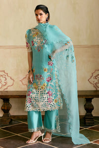 Featuring an aqua and ivory silk organza kurta with delicate applique, beadwork, and cutwork, paired with aqua chanderi contrast cutwork pants, and complemented by an aqua silk organza dupatta adorned with intricate cutwork.