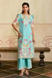 Featuring an aqua and ivory silk organza kurta with intricate applique, beadwork, and cutwork, paired with aqua chanderi pants accented by striking contrast cutwork.