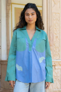 Featuring Aqua Blue Vienna Shirt from URAIB's collection Summer Lovin'. The product is made from 100% cotton poplin highlighing hand embroidered leaves on the shirt with pockets along with intricate back detailing.