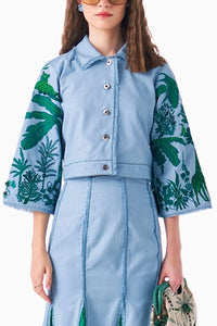 Featuring cotton denim in a refreshing Grassland Aqua hue, this embroidered jacket brings the jungle to life with bold contrast sleeves and intricate detailing. Frayed accents on the placket and metal buttons add an edgy touch, while the relaxed fit and cropped silhouette offer effortless style.