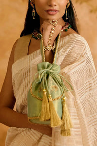 Featuring the Aqua Rose Potli Bag, this elegant accessory enhances your festive outfits with a touch of sophistication. Crafted from Chevron Tissue Fabric, it showcases beautiful floral aari embroidery and beaded lace detailing that elevate your style. The Zari tassels add a charming finish to the design.