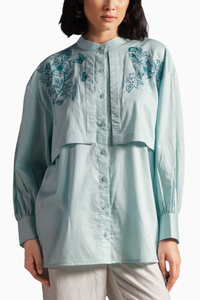 Discover effortless style with our double-layered oversized shirt, designed with a relaxed drop shoulder for a laid-back yet polished appearance. Adorned with stunning embroidery on the front, back panel, and sleeves, this shirt adds a touch of artistic flair. The gathered effect enhances the shirt’s unique silhouette, making it the perfect choice for a casual yet confident look.