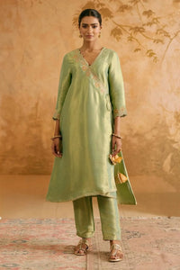 The Aqua Zari Tissue Angrakha with Narrow Pants seamlessly blends tradition with modern sophistication. Crafted from luxurious zari tissue fabric, the Angrakha showcases a chevron pattern that adds depth to its golden sheen. Featuring classic overlapping panels with handcrafted fabric tassels, this regal design is further enhanced with intricate applique embroidery along the neckline and sleeves. Paired with sleek, narrow-fit pants, this chic ensemble is perfect for festive occasions, offering an elegant and contemporary look.