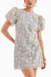 Introducing the Delicate Floral Embroidered Organza Short Straight Dress. This lovely piece features puff short sleeves and a chic zero neckline, complemented by a side zip for ease. The stunning scallop detailing at the hem adds an elegant touch, making it perfect for any special occasion!