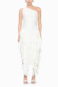Featuring an asymmetric neckline and cascading side ruffles, this one-shoulder midi dress is crafted in all-over Schiffli embroidery for a textured, elegant look. Designed in a slim fit with a concealed side zip and full lining, it offers a seamless and refined finish.