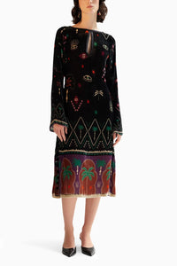 NOIB delves into printed velvet this season with the Tina Midi. Featuring elegant bell sleeves and a side slit that can be buttoned to your preferred length, this dress is a perfect choice for all your upcoming winter festive outings. Embrace the luxurious texture and make a statement at your next celebration!