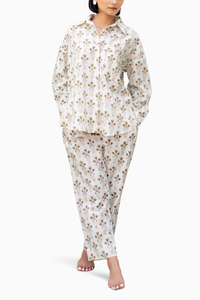 This ultra-chic and cozy combo includes a top and pants adorned with a gorgeous araki flower block print. Made from premium cotton material, this set is ideal for chilling at home or completing tasks in fashion. Bask in the luxurious vibe of the handmade brass buttons. This outfit is made in 100% cotton zayka fabric, elastic on the back of the pants make it an easy fit! The shirt comes in a loose easy fit style!