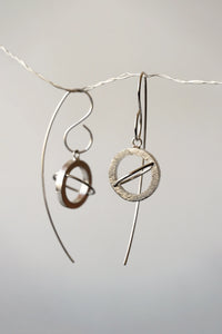 Minimal brass earrings featuring abstract circular and orbital motifs in a warm silver finish. Suspended from fine linear drops, they offer a modern, artistic silhouette with effortless elegance.