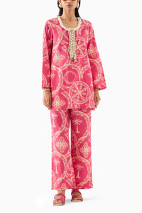 The Areca Palm Short Kurta and Pants crafted from our 100% cotton fabrication, trans-seasonal, is a statement piece. The kurta, made in our pink round print, is part of a 2 piece set. With a hand embroidered neckline, this kurta is lined and has full sleeves. Featuring a summery look, it has high slits. Paired with our Areca printed straight pants with a side zipper, it looks chic. Wear it with heels for an elegant look.ÂÂ