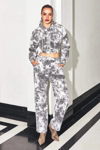 A striking black and white tweed coord set, featuring a bold textured pattern that adds depth and visual interest. The tailored fit of both the top and bottom creates a sleek, sophisticated silhouette, while the classic tweed fabric lends a timeless yet modern touch. Perfect for a refined, fashion-forward look.