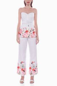 Structured tube blazer with sweetheart neckline featuring our soft floral print. Pair it with the Aria trouser for the complete look. These floral placement print elementary high-waisted trousers feature a flared silhouette. Style it together for a balanced yet edgy look.