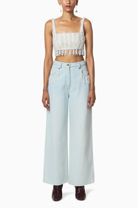 Aria Jeans is 4-pocket denim jeans have a straight, baggy fit. It sits perfectly at waist and feature a zip and button closure. Finished with hand-embroidered tassel details on the pockets for a unique look.