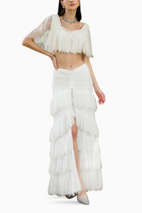 Featuring Ariel Co-Ord Set by The House of Exotique. Embrace elegance in a white Chantilly lace off-shoulder top paired with a tiered skirt. Experience comfort with a touch of sophistication.