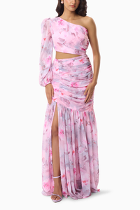 This long dress exudes elegance with its one-shoulder design and voluminous puff sleeves. The gathered bodice and side cutout detailing add a touch of allure, while the front slit enhances movement. Whether styled with sandals for a casual day out or paired with heels for a sophisticated event, it effortlessly transitions from day to night.