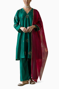 Featuring Arifa Kurta Set by Shikha Mehta from their Kala Collection. This elegant ensemble showcases an emerald silk chanderi kurta, beautifully embroidered and block printed for a striking look. Paired with embroidered silk chanderi payjama and a contrasting silk organza dupatta, it effortlessly blends tradition with contemporary style. Perfect for festive occasions, this set radiates charm and sophistication.