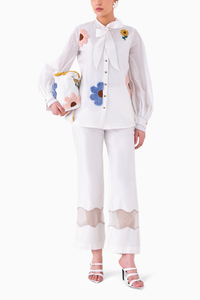 Introduce elegance to your wardrobe with the Arisa White Silk Chanderi Embroidered Shirt paired with matching designer pants. This stunning shirt features intricate floral applique embroidery and playful front tie knots, complemented by a front placket with wooden buttons for a touch of charm. The relaxed-fit top beautifully pairs with straight-fit ankle-length pants, which feature an elasticated back for comfort, side pockets, and a side zipper for convenience. The pants are adorned with organza appliques highlighted by delicate beadwork at the bottom, creating a cohesive and sophisticated look perfect for any occasion.