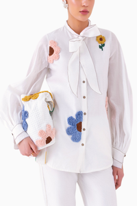 Introducing the Arisa White Silk Chanderi Embroidered Shirt, a timeless piece that exudes elegance. This shirt features beautiful floral applique embroidery and charming front tie knots for a playful touch. The front placket is adorned with unique wooden buttons, adding a rustic element. With its relaxed fit, this shirt is perfect for effortless style—ideal for both casual and dressy occasions!