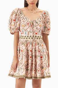 The a rista Dress is a breezy short dress tha t perfectly blends pla yful cha rm with refined deta iling. Cra fted in a cool, brea tha ble viscose-linen blend, it fea tures a vibra nt summer print tha t combines flora ls with whimsica l na utica l motifs. The ba bydoll silhouette is enha nced by smocking a t the ba ck for a comforta ble a nd fla ttering fit, while a chic front tie-up a dds a touch of flirta tious fla ir. Ga thers a t the wa ist crea te a softly voluminous skirt, a dding movement a nd elega nce. a sta ndout deta il is the delica tely embroidered wa istba nd, a dorned with sea lea f motifs a nd subtle bea dwork, bringing a hint of coa sta l ma gic to this effortlessly stylish piece.
