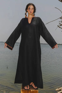 Minimal yet mindful: Sandra Embroidered Kaftan! A timeless everyday edit.100% goodness of linen. Deep contrast neckline adds quiet sophistication. A clean silhouette with a quiet elegance perfect for everyday ease with a hint of tradition.